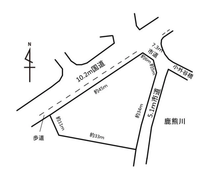 三方 北西 間口45m 公道 幅10.2m 南東 間口34m 公道 幅5.1m |